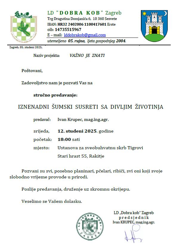 U okviru projekta "Važno je znati" u srijedu 12. studenog 2025. s početkom u 18 sati u Ustanovi za sveobuhvatnu skrb "Tigrovi" u Rakitju, Stari hrast 55, održat će se edukativno predavanje "Iznenadni šumski susreti s divljim životinjama", namijenjeno hrvatskim braniteljima iz Domovinskog rata, kao i svim zainteresiranim građanima koji svoje slobodno vrijeme provode u prirodi.